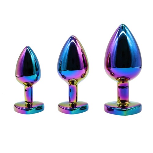 Give your booty a rainbow of pleasure with rainbow finish metal anal plugs with heart-shaped sparkly jewel bases! Train from newbie to expert easily.