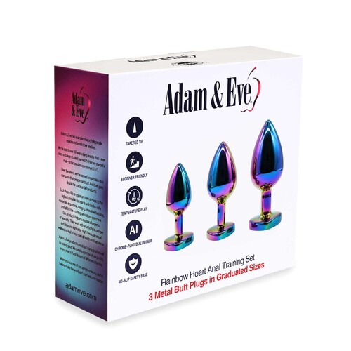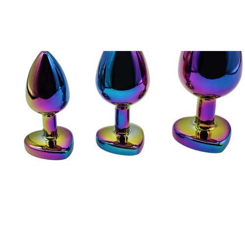 Give your booty a rainbow of pleasure with rainbow finish metal anal plugs with heart-shaped sparkly jewel bases! Train from newbie to expert easily.