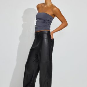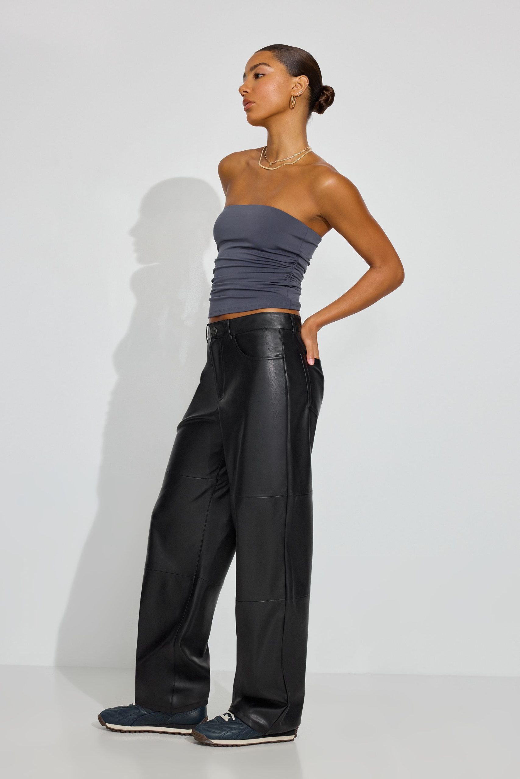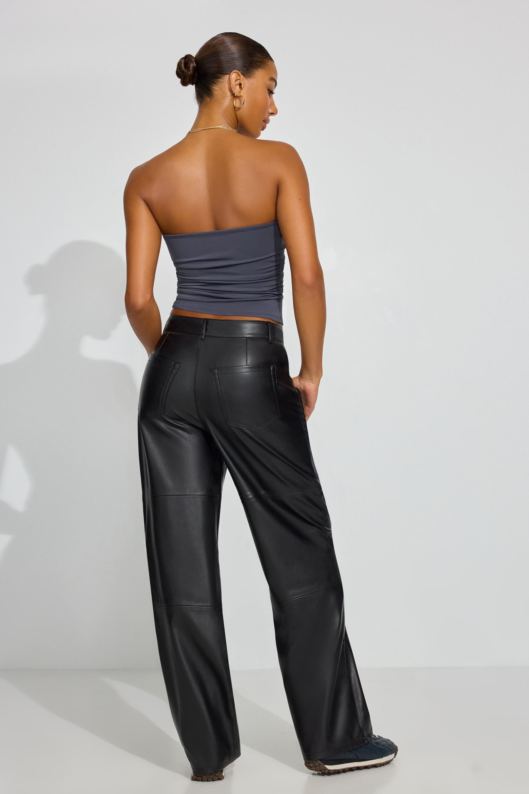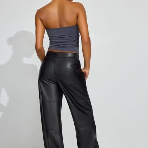 Baggy Faux-Leather Pants Black women – Showing up in faux-leather head to toe, from the jacket to the pants. Features Five-pocket styling Zip-fly with button closure Grained faux leather Size & Fit Fit: Baggy Rise: 11.5