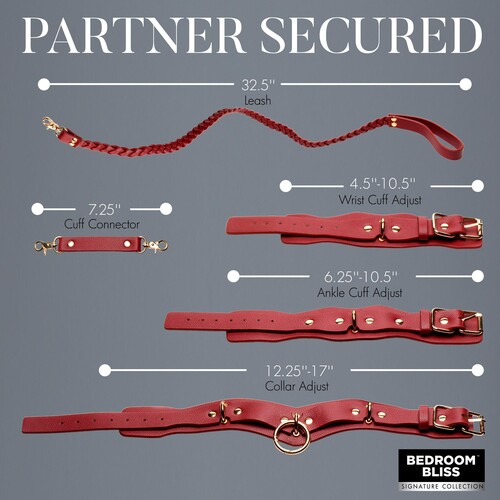 Live your naughtiest bondage fantasies with this colorful 8-piece faux leather set! Wrist cuffs, ankle cuffs & more included. Discreet shipping + gift.