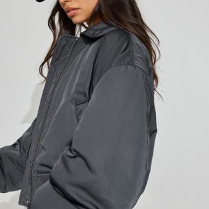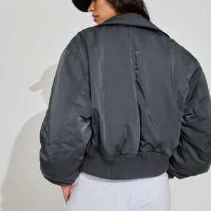 Bomber Jacket Blue women – This bomber jacket would pair beautifully with some baggy denim ! Features Spread collar Front zip closure Welt pockets with snap closure Elasticized knit hem and cuffs for the perfect fit Lined Size & Fit Fit: Oversized Length: Regular Model is wearing size S Materials & Care Content: 100% polyester Care: Machine wash, cold Imported