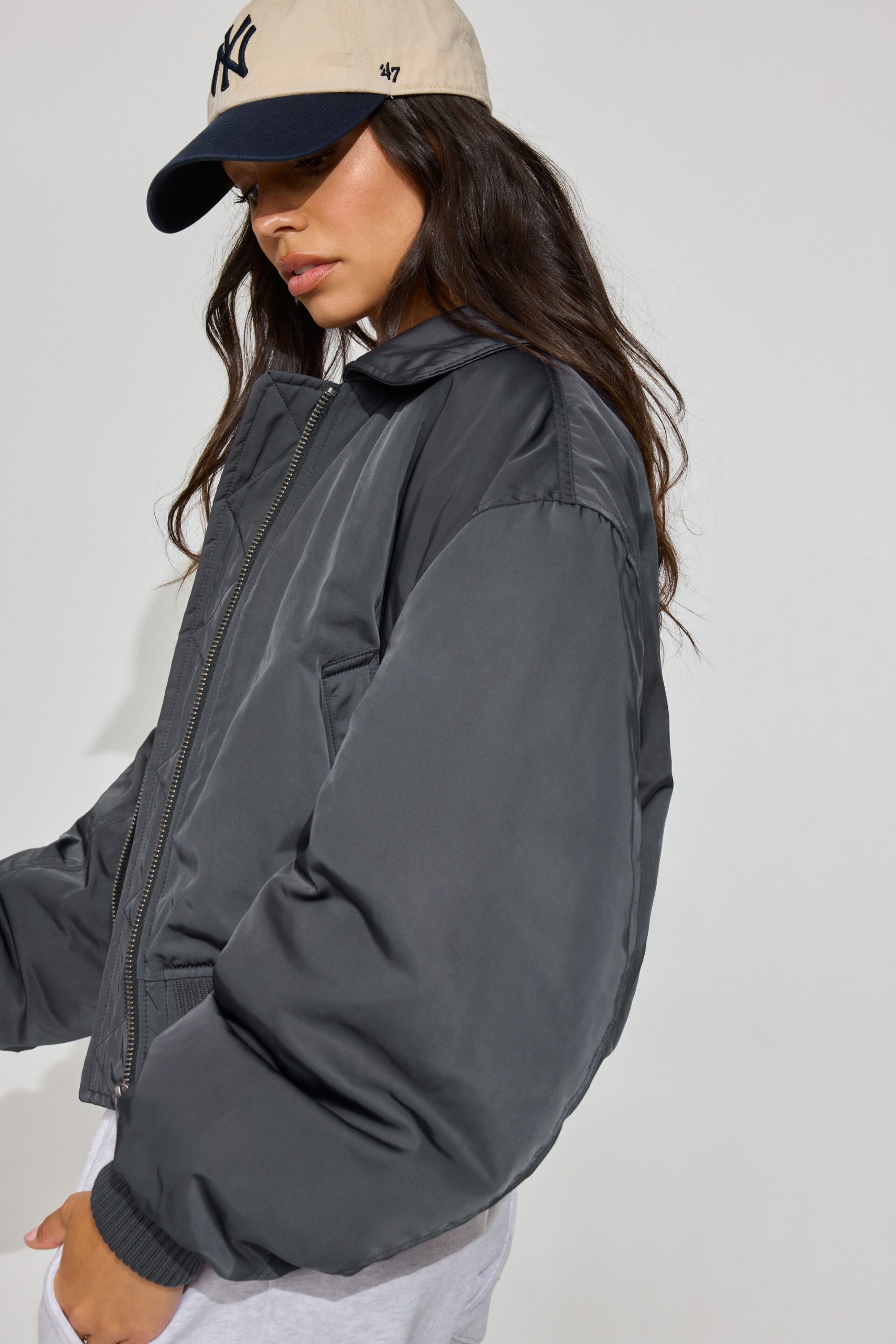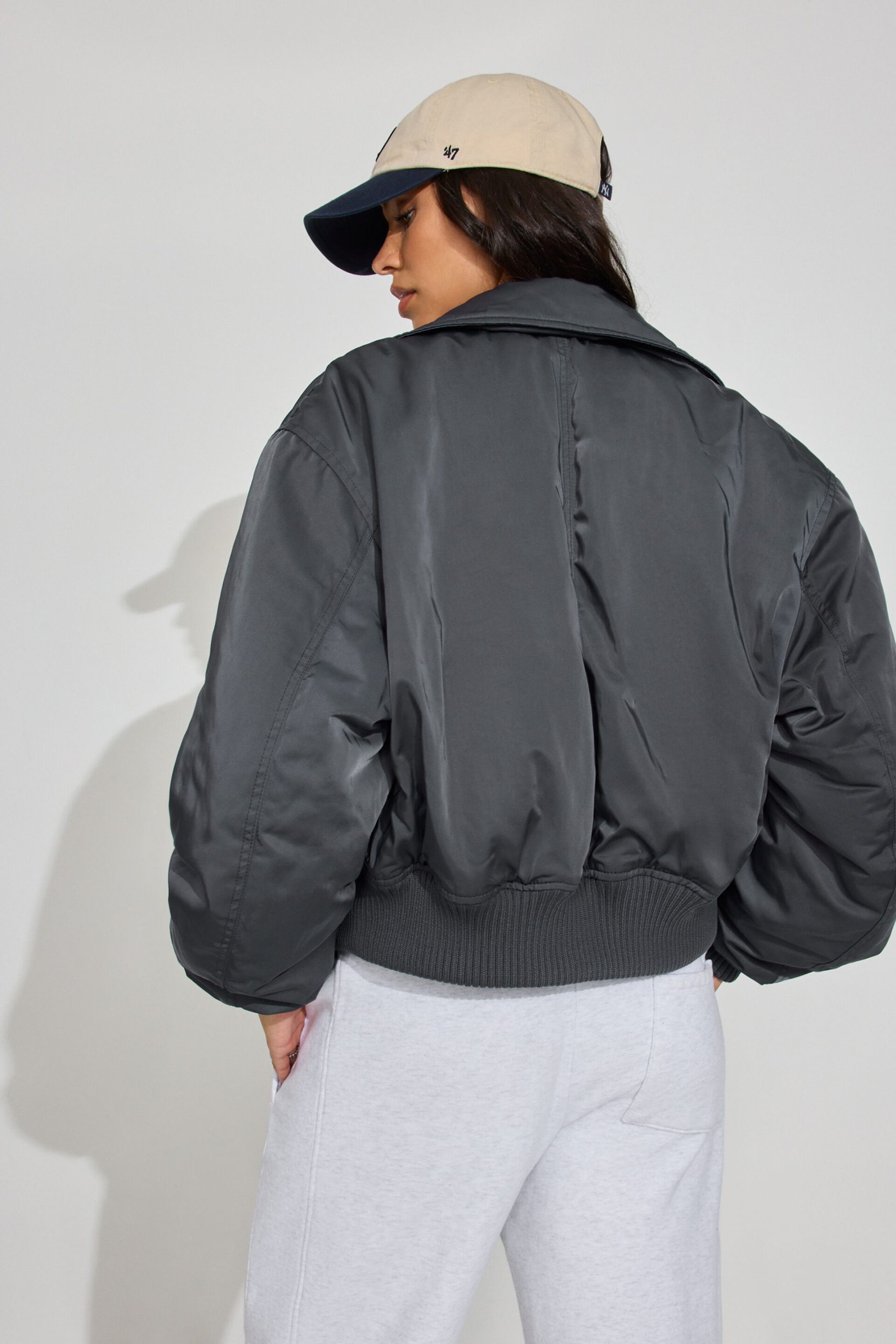 Bomber Jacket Blue women – This bomber jacket would pair beautifully with some baggy denim ! Features Spread collar Front zip closure Welt pockets with snap closure Elasticized knit hem and cuffs for the perfect fit Lined Size & Fit Fit: Oversized Length: Regular Model is wearing size S Materials & Care Content: 100% polyester Care: Machine wash, cold Imported
