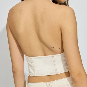 Buckled Denim Halter Top Beige women – Denim halter top and matching jeans , it’s giving yee-haw. Features Halter neck Adjustable pin-buckle belt at front Open back Size & Fit Fit: Fitted Length: Cropped Model is wearing size S Materials & Care Content: 85% cotton, 15% recycled cotton Care: Machine wash, cold Imported