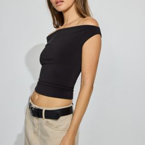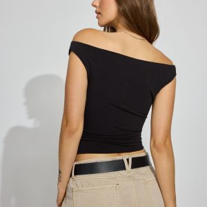 Clean Off Shoulder Top Black women – Not our us being in our off shoulder era… Features Off-the-shoulder construction Double lined Size & Fit Fit: Fitted, stretchy Length: Regular Model is wearing size S Materials & Care Content: 93% recycled polyester, 7% spandex Care: Machine wash, cold Imported