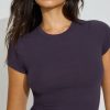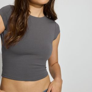 Crewneck Open Back Short Sleeve Top Gray women – Business in the front, party in the back. Features Self-tie halter strap at crewneck Open back Double lined Size & Fit Fit: Fitted, stretchy Length: Cropped Model is wearing size S Materials & Care Content: 95% cotton, 5% spandex Care: Machine wash, cold Imported