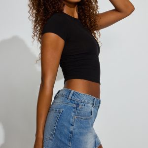 Denim Micro Skort Blue women – Nothing beats a denim skirt & a tank top , timeless <3 Features Belt loops Zip-fly with button closure Five-pocket styling Shorts-style lining Size & Fit Length: Mini Front rise: 9.5
