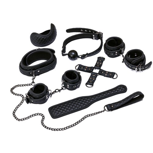 Save over $100 with this kinky bondage set! The 7-piece set includes multiple restraints, leash & collar, ball gag, paddle & blindfold. Order yours today.