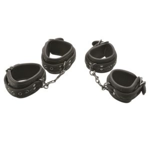 Get down & dirty with this kinky 4-piece bondage set for beginners! Wrist cuffs, ankle cuffs, paddle & blindfold included. Order now for discreet shipping.