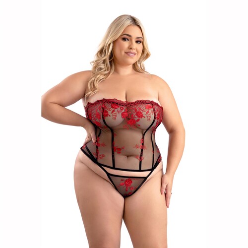 Embroidered floral corset & matching G-String panty! Racy mesh and lace-up back add edgy yet elegant style!