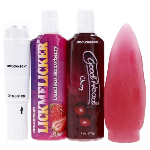 Get & Give Hotter Oral With This Fun-Filled Kit! Cherry-Flavored Gel, Strawberry-Flavored Gel, Vibe & Tongue Sleeve Included.