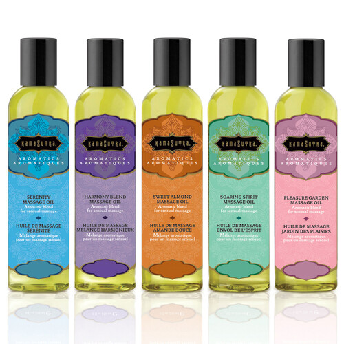 Pamper yourself & your lover with 5 sensual massage oils: Soaring Spirit, Sweet Almond, Serenity, Pleasure Garden & Harmony Blend. Order yours today.