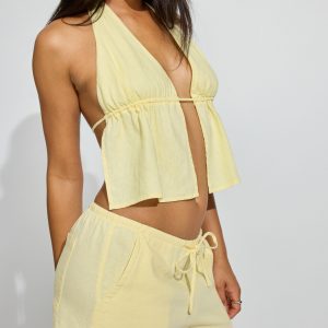 Linen Mini Shorts Yellow women – This and a little tee ? We love. Features Drawstring at elasticized waistband Four-pocket styling Size & Fit Length: Mini Model is wearing size S Materials & Care 52% linen, 48% viscose Machine wash, cold Imported