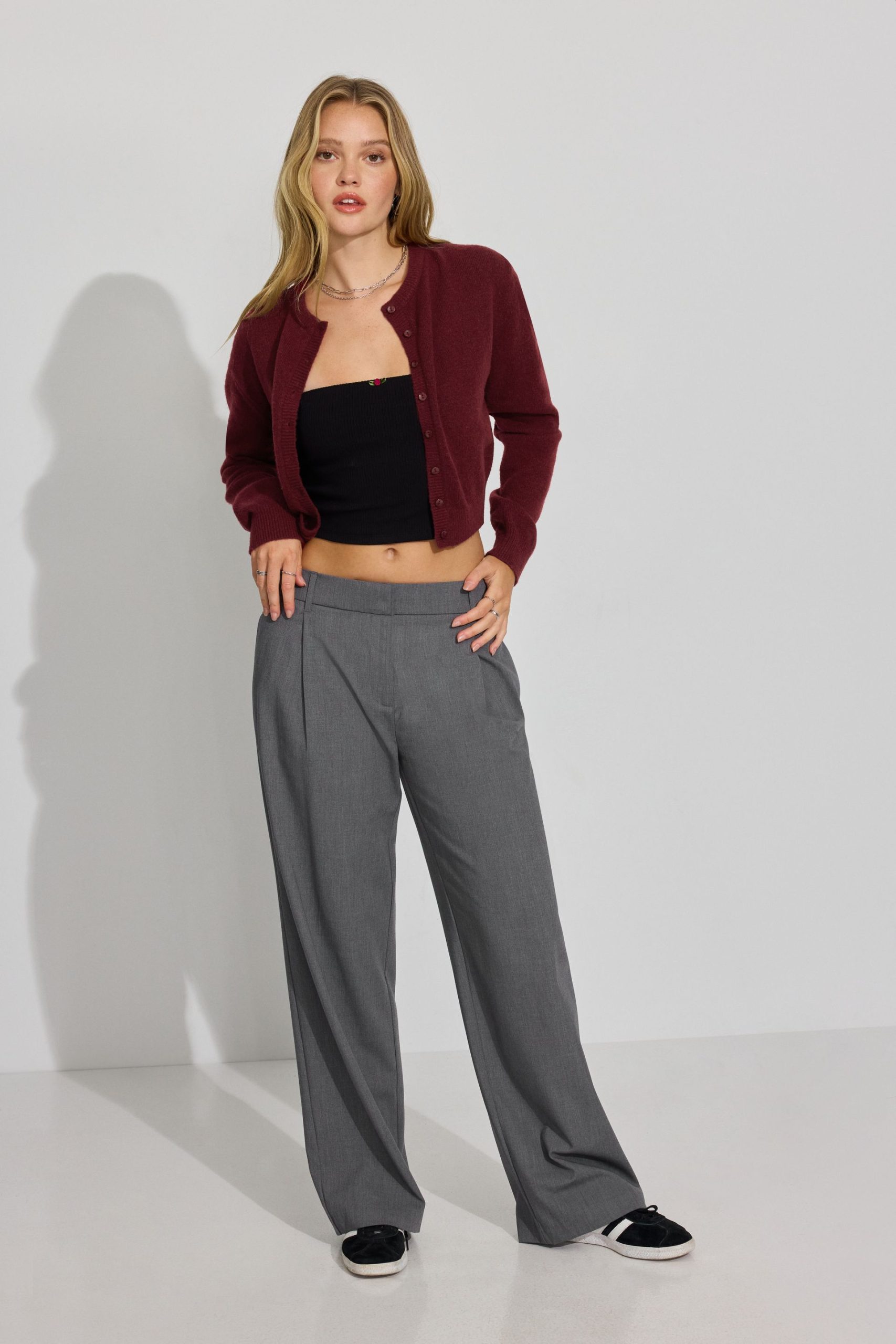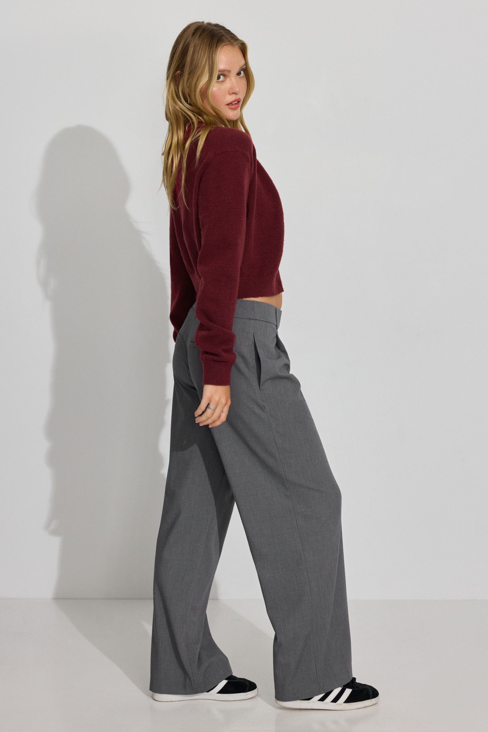 Low Rise Relaxed Trousers Grey women – The trousers are trousering. It’s giving business casual girlboss. Features Belt loops Zip-fly with hook-eye closure Four-pocket styling Pleats at front Size & Fit Fit: Relaxed Rise: 11
