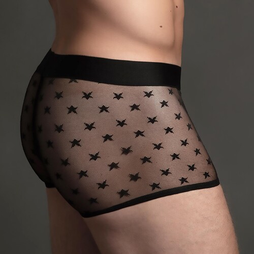 Come on, boys! Show ‘em some skin in these flashy sheer boxers. An all-star pattern emphasizes what your exposed package reveals: you’re a big deal!