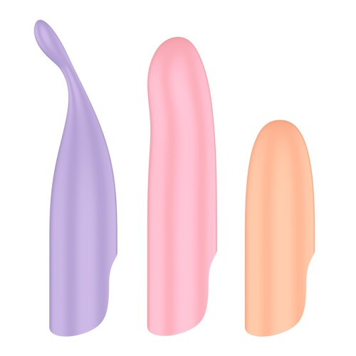 Play with 4 wild vibes in one sexy kit! Slide 4 silicone sleeves onto a powerful vibrating bullet base to create just the vibe you crave.