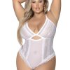 Suit up for scandalous seduction in this revealing lace bodysuit with crotchless design. Set your partner's pulse racing! Plus-size available.