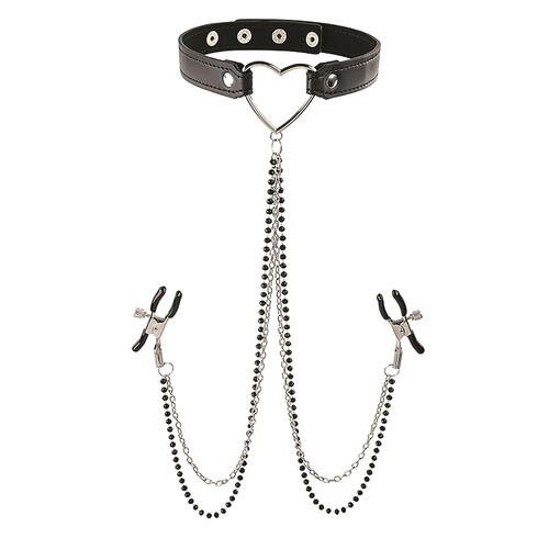 Add some heart to your nipple play! Show off your perky peaks in this cute collar + nipple clamps ensemble. Adjustable pinchers. Discreet shipping.