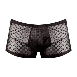 Add eye-catching sparkle and stun onlookers in this sheer diamond-pattern mesh short! See-through mesh shows you off with contoured front pouch.