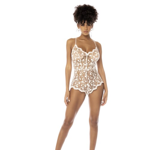 Feel graceful and gorgeous in this dreamy bridal romper. Tiny white embroidered flowers and sheer mesh paint your body beautifully. Ships fast.