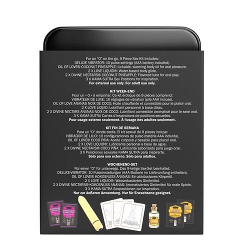 Unpack sexy romance with this naughty weekend getaway kit! Includes 10-function bullet vibe, kissable body oil, flavored lube, glide, cards, and more!